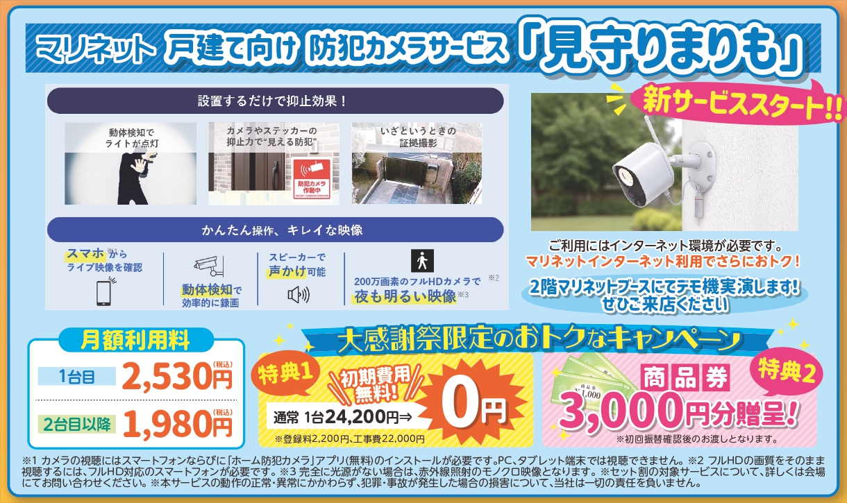 今回は新しいサービス、防犯カメラ「見守りまりも」の